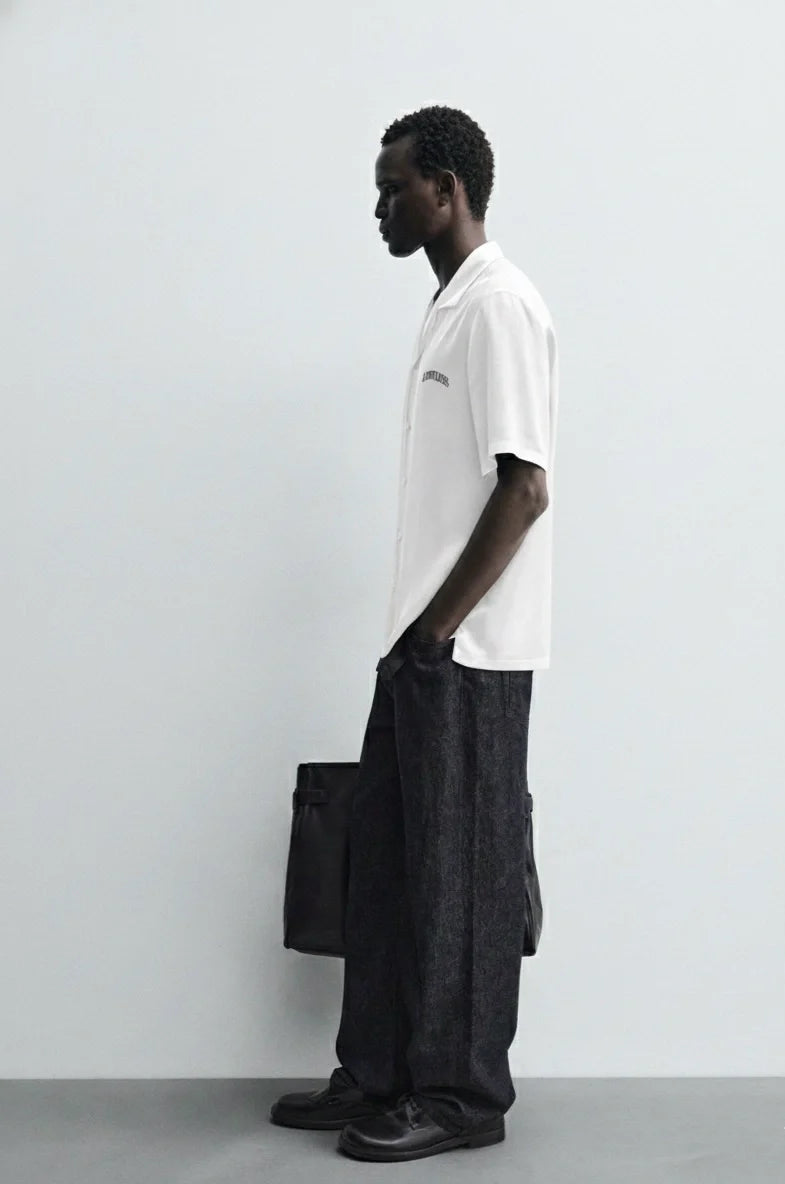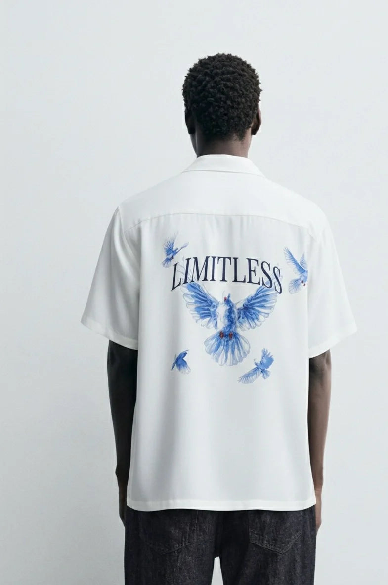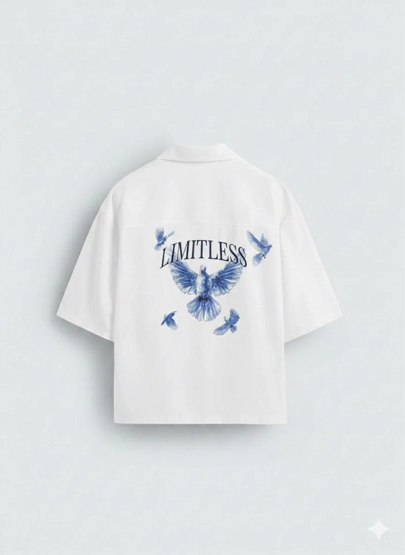 A men’s oversized, boxy streetwear shirt with soft blue doves and a “Limitless” graphic. The loose fit gives it that laid-back feel while still keeping the look fresh and airy.