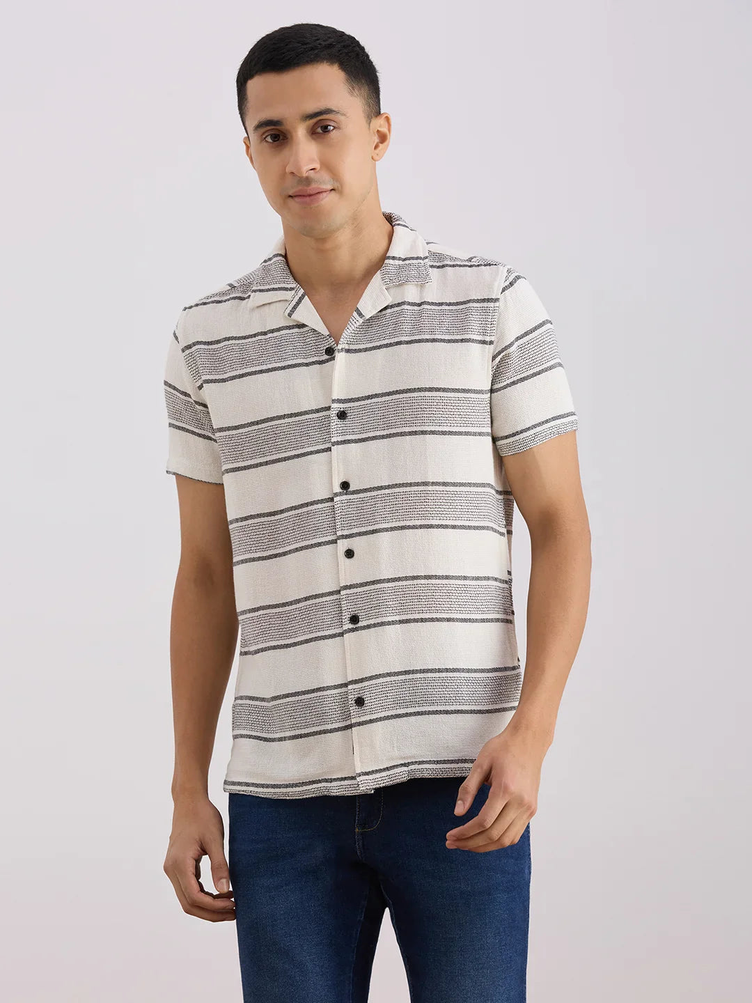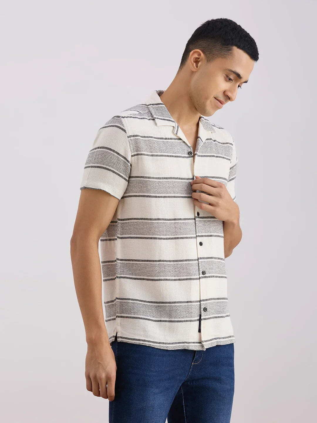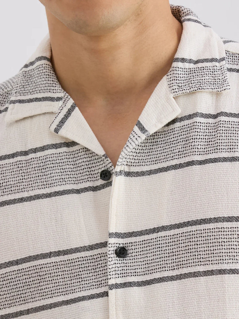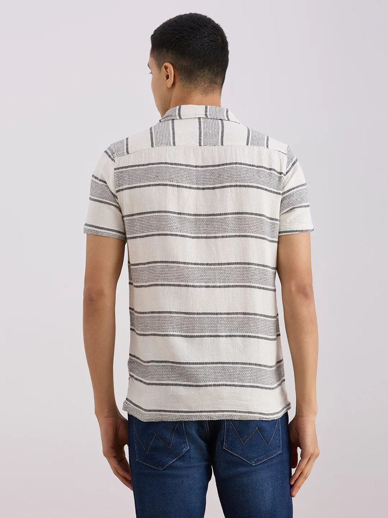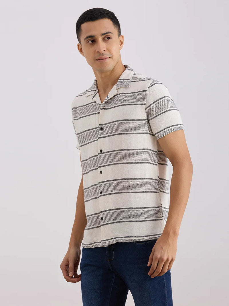 Valen Club Men's Casual Shirt With Cuban Collar Cotton Short Sleeves Striped Shirt